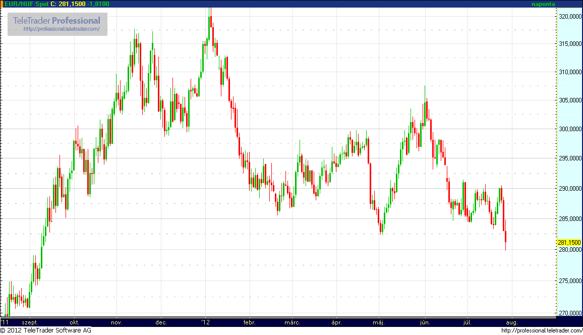 A kereskedők szerint az euró és vele együtt a forint szárnyalását az váltotta ki, hogy a német szóvivő megerősítette: Angela Merkel kancellár és Francois Hollande francia elnök délelőtt telefonbeszélgetést folytatott, és kinyilvánították, hogy mélyen elkötelezettek az euróövezet integritásának megőrzése mellett. Jól hatott a piacokra Wolfgang Schäuble német pénzügyminiszter nyilatkozata is, aki egyetértéséről biztosította Mario Draghi EKB-elnököt, aki csütörtökön kijelentette: az EKB mandátumán belül minden lehetséges eszközt felhasznál az euró megvédésére. (MTI)
