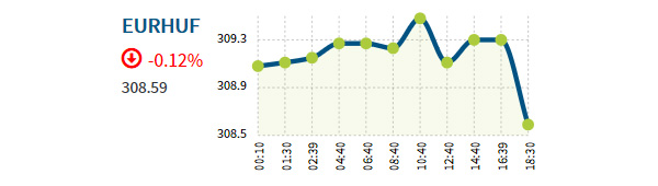Az euró jegyzése a kora reggeli 309,10 forintról este fél hétre 308,60 forintra csökkent, a svájci franké pedig 263,85 forintról 262,75 forintra ment le.