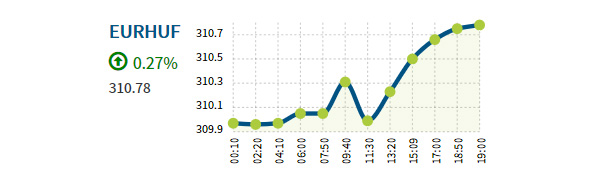 Az euró 310,76 forintra erősödött este fél hét körül a kora reggeli 310,04 forintról. Jegyzése napközben 309,81 és 310,92 forint között mozgott.