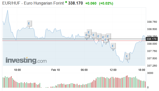 Az euró a reggeli 338,24 forintról 18 órára 338,04 forintra gyengült.