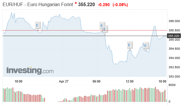 Az euró a reggeli 355,25 forintról 18.15 órára 355,02 forintra gyengült.