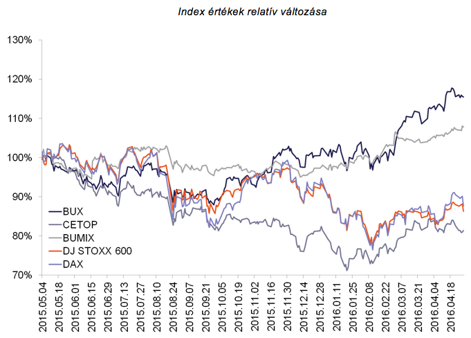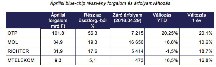A BUX index áprilisban 1,59%-ot erősödött. A blue-chipek közül egyedül a Richter teljesítménye volt negatív, az OTP a MOL és az MTELEKOM emelkedni tudott az elmúlt hónapban.