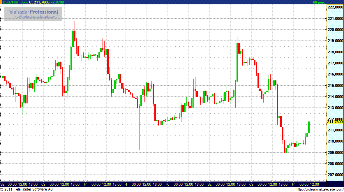 Csütörtökön napközben gyengült az árfolyam, estére azonban az euróhoz viszonyítva a 302 forint körüli árfolyamról egészen a 298 forintos szintig erősödött vissza. Pénteken kora délelőtt ismét gyengülni kezdett az árfolyam. Háromnegyed tízkor az eurót 300,25 forinton jegyezték, a reggeli 298,10 forint és az előző esti 298,16 forint után.