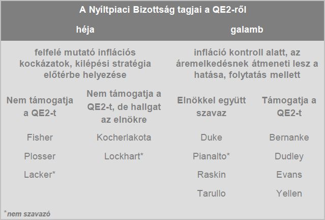 2010. novembere óta nem állt be érdemi változás a FED politikájában, bár 2011 eleje óta valamelyest megváltozott a FED monetáris tanácsának összetétele. Az áprilisi FED-döntés előtt az Equilor górcső alá vette a grémium tagjainak nyilatkozatait, amelyből következtetni lehet a következő hónapok jegybanki politikájára. A FED monetáris tanácsa jelenleg tíz tagból áll, akiket egy nagyobb csapatból választanak ki előre meghatározott rotációs sorrendben. Ők az utóbbi hónapokban nagyjából azonos álláspontokat képviseltek. A monetáris politikát és azon belül a kötvényvásárlási programot érintő vélemények alapján az alábbi felosztás mutatkozik: