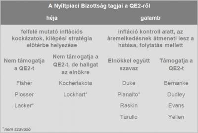 A csoportosításból jól látszik, hogy az idén nem szavazó tagokat figyelmen kívül hagyva 7:3 az arány a Bernanke vezette csapat javára. Vagyis, ha politikai oldalról nem szabnak gátat a program működésének, akkor könnyen lehet, hogy a gazdasági helyzet függvényében további eszközvásárlási program indul a következő hónapokban.