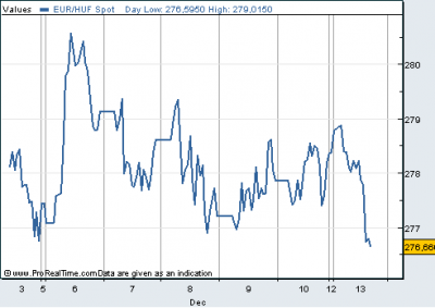 A nemzetközi kereskedelemben péntek estére 278 alá erősödött a forint az euróval szemben, 20 óra körül az eurót 277,40 forinton, a svájci frankot 213,64 forinton jegyezték, ám hétfő kora reggelre az árfolyamok ismét 278, illetve 214 fölé emelkedtek.