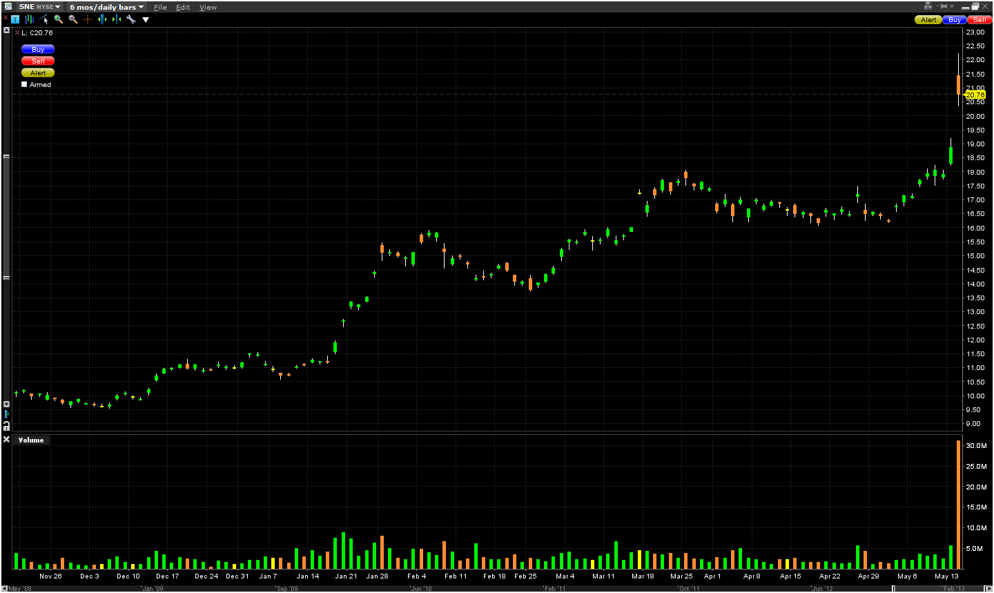 Egy egyszerű példa erre a Sony Corporation vagy a Canon Inc. A tegnapi napon közel 10%-ot emelkedtek a Sony papírja, ami ugye a japán kormány gazdaságélénkítő csomagjainak köszönhető. Ebből profitálnak most könnyen az export cégek, és az amerikai piacon könnyen ki is tudjuk venni a részünket belőle, hiszen nem kell hajnalban kereskednünk, és felesleges váltásoknak sem kell kitennünk meglévő dollárunkat.