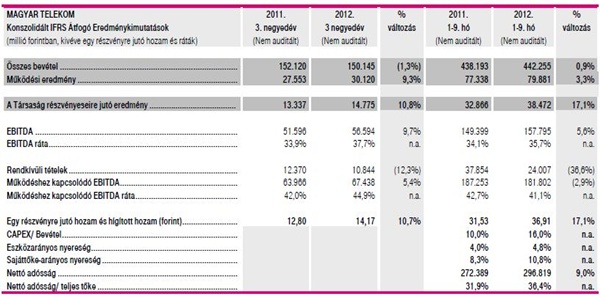 A Társaság részvényeseire jutó eredmény (nettó eredmény) 13,3 milliárd forintról 14,8 milliárd forintra nőtt, tükrözve a magasabb EBITDAt. Az üzleti tevékenységből származó nettó cash flow 28,8 milliárd forinttal 134,2 milliárd forintról 105,4 milliárd forintra csökkent 2012. első kilenc hónapban az előző év azonos időszakához képest. A nettó adósságállomány a 2011. szeptember végi 272,4 milliárd forintról 2012. szeptember végére 296,8 milliárd forintra nőtt. A nettó eladósodottsági ráta (a nettó adósságnak az összes tőkére vetített aránya) 2012. szeptember végén 36,4 százalék volt.