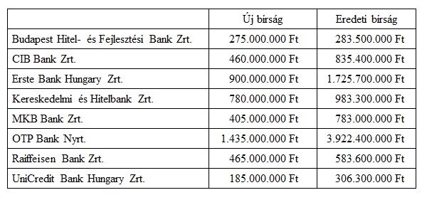 A megismételt eljárásban a GVH – a Kúria iránymutatásait figyelembe véve – a GVH Elnökének és a Versenytanács elnökének 11/2017. sz. közleményét alkalmazta a bírság megállapításakor, ennek eredményeként az alábbi összegű bírságot szabta ki az egyes bankokkal szemben: