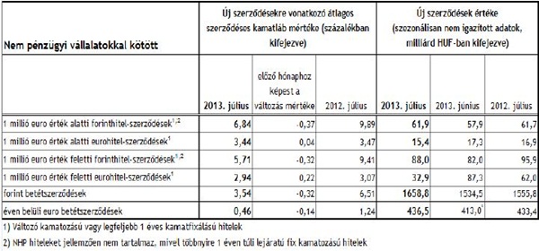 2013. júliusban a háztartások által felvett új forint lakáscélú, szabad felhasználású jelzáloghitelek és személyi hitelek átlagos hitelköltség mutatói csökkentek. A lakáscélú hitelek kamata egy év alatt 12-ről 9,5 százalékra mérséklődött, az előző havinál 0,1 százalékponttal lett alacsonyabb. A forint személyi hitel kamatok éves összevetésben 28,68 százalékról 3 százalékponttal, 25,64 százalékra csökkentek, míg az előző hónaphoz képest 1,68 százalékkal mérséklődtek.