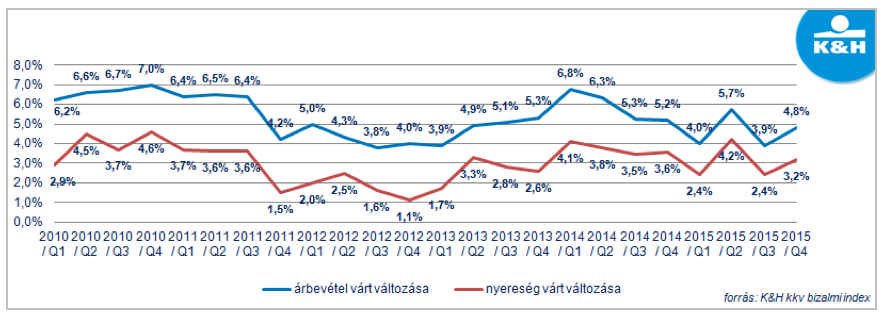 A hazai vállalkozások eredményüket tekintve is derűlátóbbak lettek 2,4%-ról 3,2%-ra ugrott a várt profit mértéke a teljes kkv szektor szintjén. Idén a kkv-k 91%-a vár növekedést, azonban a tavalyinál kisebb nyereséggel számoló cégek aránya közel duplájára, 5%-ról 9%-ra nőtt. Az eredményeket tekintve a középvállalkozások és a mikrovállakozások hasonlóan jó eredményt valószínűsítenek – 3,7% és 3,5% –, míg a kisvállalkozások e tekintetben is szerényebbek, mindössze 2,6%-os profitnövekedést várnak idén. A szektorok közül a mezőgazdasági és szolgáltató cégek visszafogottabbak – 2,3% és 2,7% –, míg a kereskedelmi és ipari cégek közel azonos mértékékű, ennél jóval nagyobb nyereség-növekedést várnak (3,6% és 3,7%).
