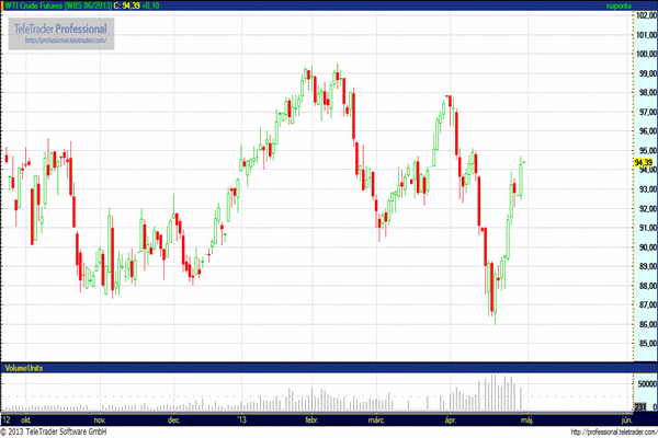 A júniusi szállítású amerikai könnyűolaj árfolyama hétfőn 1,50 dollárral, 1,6 százalékkal 94,50 dollárra emelkedett hordónként a Nymex piacán. Ilyen magas szinten aktív kontraktus április 10 óta nem volt. A ma reggeli ázsiai elektronikus kereskedésben a kontraktus enyhe csökkenést mutat, 0,11 százalékkal 94,40 dollárra ereszkedett. Hétfőn az északi-tengeri Brent típusú kőolaj jegyzése 65 centtel 103,81 dollárra emelkedett az ICE határidős kereskedésében.
