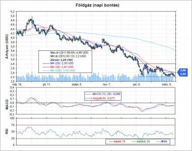 Konkrét fordulós jelzés egyelőre nem látható a grafikonon, ennek ellenére érdemes vételi pozíciót nyitni. Ne felejtsük, hogy fontos támaszon tartózkodik az árfolyam, és a fundamentumok is azt sugallják, hogy hamarosan eljön az ideje a fordulatnak. Ezért arra számítunk, hogy a támaszról visszapattan a kurzus, és visszateszteli a 2,44-2,46 közötti ellenállást. Ezt a szintet jelöljük ki célárfolyamnak, míg stop-loss szintnek 2,15 dollárt választhatjuk. Kockázatos vételnek mondhatjuk, mert nincs fordulós jelzés, de kedvező hozam/kockázat arány (3:1) mellett léphetünk piacra. Ha az ellenállást jelentő rést (2,44-2,46) is sikerül betöltenie a földgáznak, akkor középtávon is trendforduló alakulhat ki.