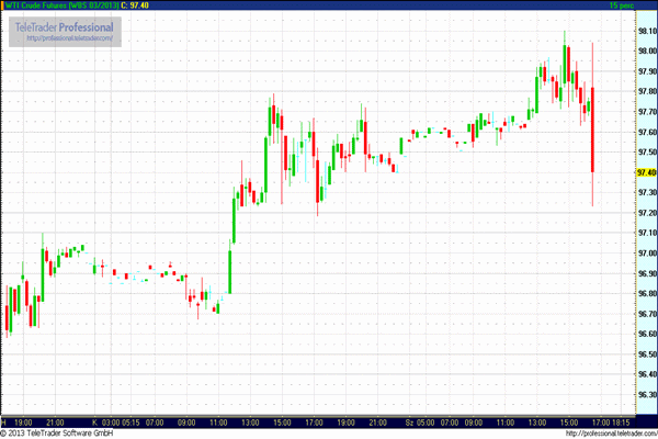 Az olaj árfolyama emelkedett, majd csökkent a készletadatok ismertetését követően. A márciusi szállítású amerikai könnyűolaj jegyzése 98 dollárig emelkedett, ezt követően csökkent. Jelenleg 97,39 dollárnál születnek kötések, ami 0,11 százalékos csökkenést jelent.