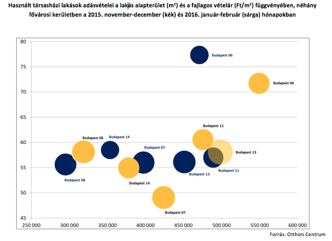 Az új lakásokhoz képest a fővárosban a használt társasházi lakások fajlagos ára az idei év első két hónapjában 220-660 ezer Ft/m2 között alakult. A legtöbb kerületben az áremelkedés mértéke 10% alatt maradt, kivéve a IV, VI, XVIII és XXI. kerületeket, ahol kis mértékben ezt meghaladó növekedés volt. Ugyanakkor azokban a kerületekben, ahol a legdrágább – 500 ezer Ft/m2-t meghaladó – fajlagos árak jellemezték a piacot – ilyen volt a budai I., a II. és a belvárosi V. kerület – úgy tűnik, hogy némileg mérséklődött az árak növekedése. Fontos megjegyezni, hogy ezekben a leginkább favorit városrészekben is nagy árkülönbség van a rossz beosztású, kedvezőtlen tájolású, lelakott ingatlanok és a befektetési szempontból favoritnak számító utcák jó állapotú lakásai között – utóbbiak iránt továbbra is jóval nagyobb a kereslet, mint az elérhető kínálat.