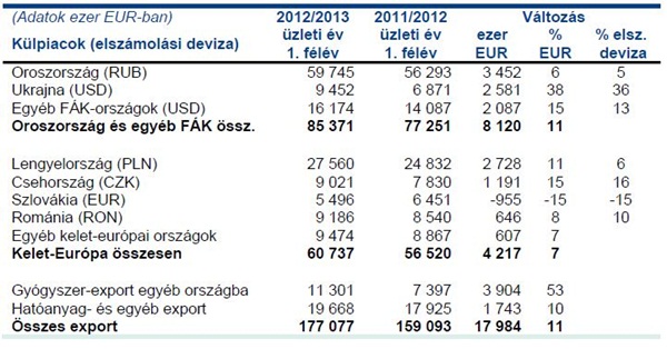 A féléves adatok alapján Oroszországban és a FÁK-régióban együttesen 11 százalékkal 85,37 millió euróra nőtt az árbevétel. Ezen belül az oroszországi kivitel 6, az ukrajnai 38 százalékkal bővült. A kelet-európai piacon 7 százalékkal 60,74 millió euróra növelte kivitelét a gyógyszergyár. Az egyéb országokba irányuló gyógyszerexport 53 százalékkal 11,3 millió euróra, a hatóanyag kivitel 10 százalékkal 19,67 millió euróra nőtt.