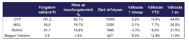 A hazai blue chipek közül az OTP bizonyult a húzóerőnek 2,2 százalékos emelkedéssel 15 955 forintra nőtt, illetve a júniusi forgalom túlnyomó részét, közel 60,1 százalékát adta ugyancsak a társaság, amelyet a MOL követett 18,7 százalékkal, a harmadik helyen pedig 15,6 százalékkal a Richter részesedett az összforgalomból. A negyedik helyen a Telekom zárt a forgalom 1,4 százalékával, míg az elmúlt hónapokban folyamatosan emelkedő Masterplast árfolyama júniusban 12,9 százalékkal növekedett.