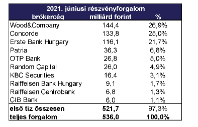 A vezető részvények közül az OTP zárt a csúcson 161,2 milliárd forint értékű összforgalommal és 60,1 százalékos forgalmi aránnyal. A részvénypiac összforgalma júniusban 268 milliárd forint volt, amely egy kereskedési napra vetítve 12,2 milliárd forintot jelent. A brókercégek forgalmi rangsorában a Wood végzett az első helyen, őt követi a Concorde, majd az Erste.