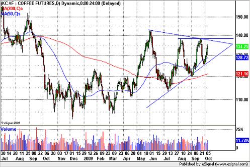 Kissé erőltetettnek tűnik a grafikonon jelölt formáció, de a lényeget így is jól mutatja. A kávé piacán magasabb mélypontok sorozatához társul alacsonyabb csúcsok sorozata, ami trend nélküli, erősen szűkülő mozgást eredményez. Ennek során egyre kiegyensúlyozottabb, nyugodtabb piac benyomását kelti, bár még így is bőven akad izgalom a hektikussága miatt.