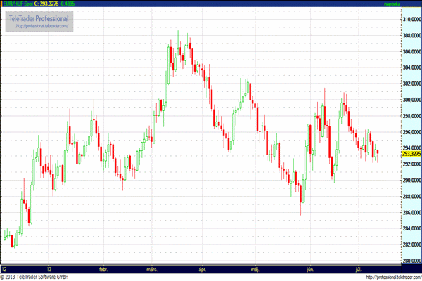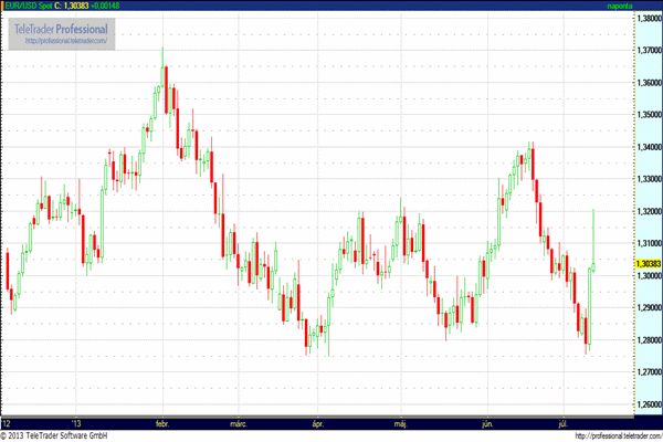 Emellett Bernanke hangsúlyozta, hogy a FED kötvényvásárlásainak csökkentése nem restriktív, hanem kevésbé expanzív politikát jelent. Így tehát a FED elnök is úgy gondolja, hogy szükséges a további mennyiségi lazítás, és csak a vásárlások mértékét fogják csökkenteni, illetve a kamatok is hosszabb ideig nulla körül maradhatnak. A dollár 1,32-ig (!!!) gyengült az euróval szemben, onnan mára korrigált 150 pontot. Az Eurozónából érkező gyatra fundamentumok miatt csak idő kérdése, hogy Draghi mikor erősít rá az ECB likviditásbővítésére, mely ismét az euro gyengülését és a dollár erősödését eredményezné. A dollár trendjének tehát vélhetően nincs vége, viszont Bernanke-nak köszönhetően sokan fel tudnak szállni a vonatra.