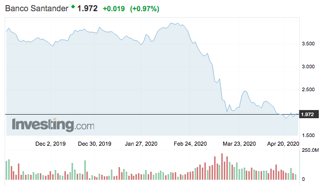 A spanyol bankcsoport 1,6 milliárd eurót már elkülönített a koronavírus miatt várhatóan romló hitelminőség miatt. Európai banktól eddig ez a legnagyobb céltartalékképzés a vírus miatt. Emiatt a profit 331 millió euróra, 82%-kal esett vissza, szemben az 1,75 milliárd eurós várakozással, de az óriási céltartalékképzés miatt a negyedéves eredmény nem összevethető a várakozásokkal. (forrás: ERSTE)