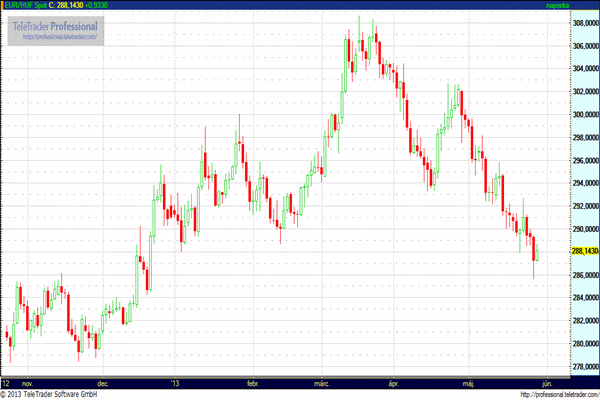 Ma reggel a zloty gyengülésének hatására, a kissé romló piaci hangulatban, tovább távolodtunk a 286 alatti szintektől. Már 288 körül jár az árfolyam, és ezen a 11%-re csökkenő munkanélküliségi ráta sem tudott fordítani, és az MNB elnökének, a hitelprogram megemeléséről szóló bejelentése is hidegen hagyta a piacokat. Mindenki a kora délutánra vár, 14 órakor érkezhet a bejelentés a túlzott deficit eljárás ügyében. A várakozások az eljárás megszüntetését valószínűsítik. Ennek hatására lehet némi erősödés, de ennek mértéke limitált maradhat.