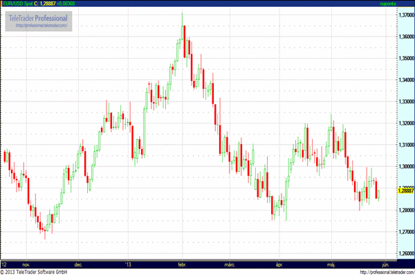 EUR/USD (1,2800 – 1,3005): A délutáni, vártnál jobb amerikai fogyasztói bizalmi index hatására 1,2860-ig rallizott a zöld hasú. Az újabb jó adat tovább növeli annak esélyét, hogy a FED belátható időn belül hozzányúl a QE3 programhoz. Az EKB felől, az utóbbi időben érkező, negatív kamatokat említő nyilatkozatok sem tettek jót a közös deviza árfolyamának, és az utóbbi időben, főleg Németországból érkező jobb makró adatok jelentősen csökkentik ennek esélyét.