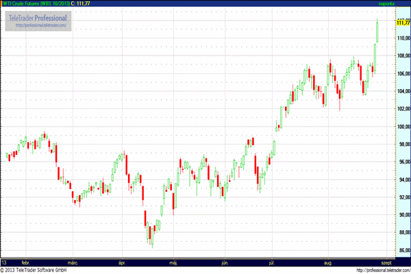 Az októberi szállítású amerikai könnyűolaj (WTI) 2,91 dolláros, 2,68 százalékos emelkedés mellett 111,92 dollárnál jár hordónként a Nymex elektronikus kereskedésében. A kontraktus tegnap közel 3 százalékot emelkedett. Több mint 2 év után ez az első alkalom, hogy a legközelebbi szállítású kontraktus árfolyama átlépte a 110 dolláros szintet.