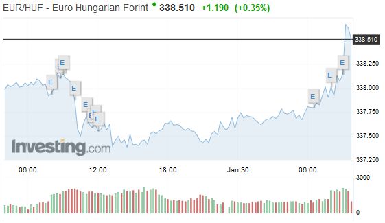 A forint euróval szemben valaha elért leggyengébb árfolyama a hétfői 338,82 forintos jegyzés volt. A dollár legmagasabb jegyzése a tavaly október eleji 308,20 forint volt, a svájci frank pedig a 2015 januári 333,01 forinton érte el a legmagasabb jegyzését.