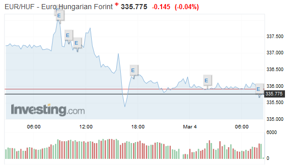 Az euró jegyzése 335,96 forintra emelkedett a kedd esti 335,75 forintról.
