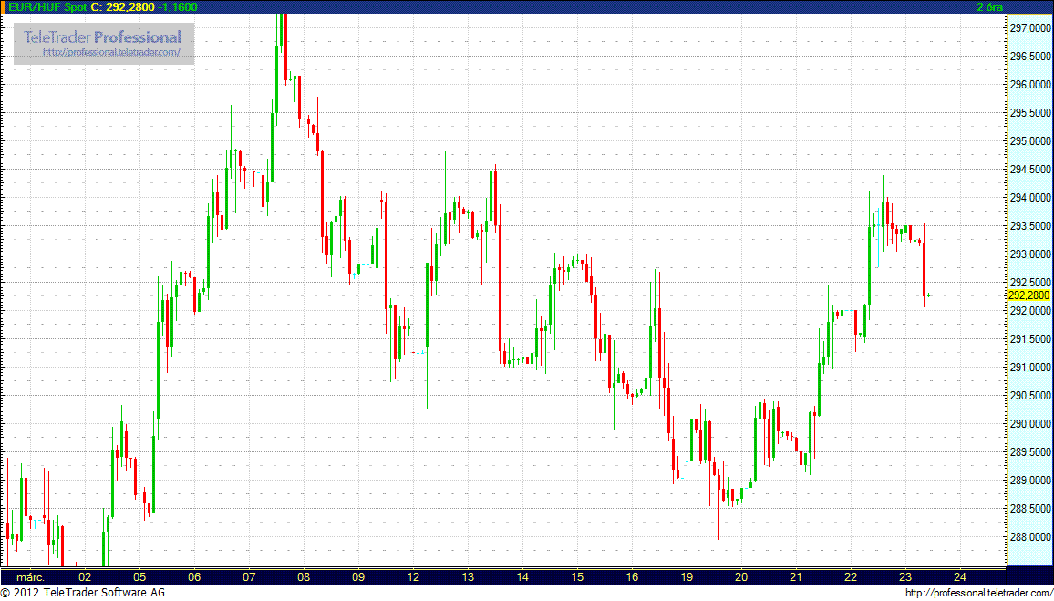 A forint-euró árfolyam pénteken szűk sávban, 293,50 és 292,50 között mozgott közepes forgalom mellett. A forint a dollárral szemben jelentősen erősödött, délelőtt 220,4 forintot adtak egy dollárért, míg reggel 222,22 forinton állt a csütörtök esti hasonló árfolyam után.