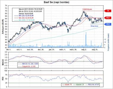 A világ legnagyobb vegyipari vállalata idén jelentősen növelni fogja árbevételét és nettó eredményét egyaránt, mivel a megrendelés-állomány továbbra is erős, Michael Heinz, a menedzsment tagja szerint. Az elemzők folyamatosan növelik a vállalat egy részvényére jutó eredményvárakozásaikat, így az EPS az idén már akár meg is haladhatja a válság előtti szintet. A BASF részvényei a 2011-re várt eredmény alapján 9,4-es P/E-n forognak, míg a – relatíve alulértékelt - DAX index 10,8-as P/E-n, ami minimum 15%-os emelkedési potenciálra utal a BASF árfolyamára nézve. Így is megkapjuk tehát a technikai elemzés által kijelölt 70 eurós célárat.