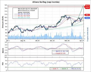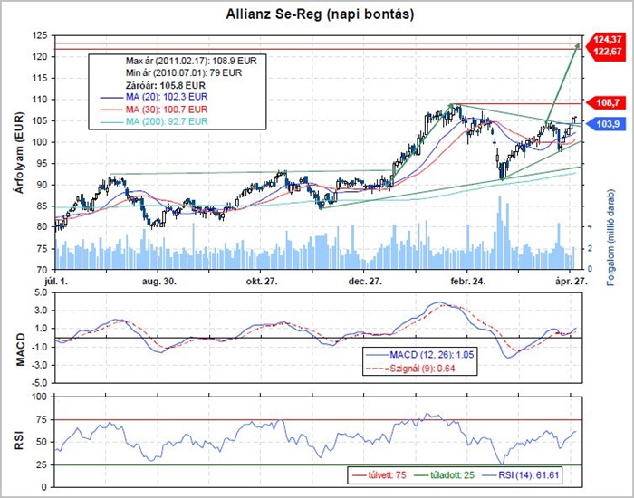 Áttörte a csökkenő trendvonalat, és a - csökkenő maximumok és emelkedő minimumok által határolt – szűkülő alakzatból is kitört felfelé. Ráadásul átlag feletti forgalommal és rés (104,1-104,4) kíséretében emelkedett tegnap, ezért úgy gondoljuk, ha kitart a lendület, akkor hamarosan a 108,7-es maximumot is áttörheti az árfolyam, és egészen a 122,67-124,37 eurós résig emelkedhet. A technikai kép összességében kedvezően fest, a DAX index is új csúcsra erősödött, és most szűk stop-loss szint mellett léphetünk piacra, és várhatjuk a további emelkedést.