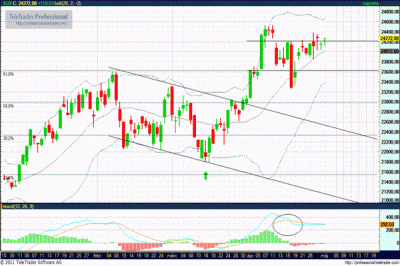 Továbbra sincs erő a piacban, ami komoly kitörést eredményezhetne. A tegnapi előnyét az index a mai napon könnyedén veszteségre válthatja. Támasz 24.030 és 23.850 pontnál.