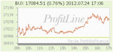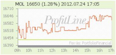 A Mol 210 forinttal, 1,28 százalékkal 16 ezer 650 forintra erősödött, 653,9 millió forintos forgalomban. Az OTP-részvények ára 1 forinttal, 0,03 százalékkal 3331 forintra nőtt, forgalmuk 2,4 milliárd forintot tett ki. A Magyar Telekom árfolyama 4 forinttal, 0,94 százalékkal 429 forintra emelkedett, forgalma 276,5 millió forint volt. A Richter-papírok árfolyama 200 forinttal, 0,53 százalékkal 37 ezer 600 forintra növelte értékét, a részvények forgalma 614,2 millió forintot ért el. A másik gyógyszeripari részvény, az Egis 30,1 millió forintos forgalom mellett 260 forinttal, 1,70 százalékkal 15 ezer 550 forintra erősödött. (MTI)