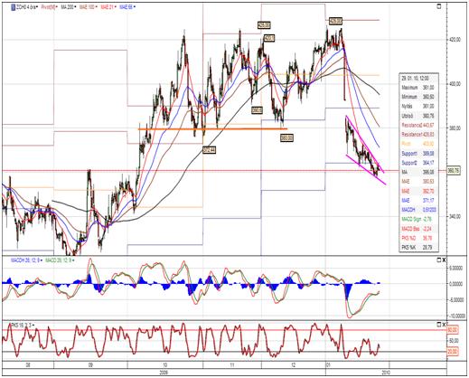 Egy csökkenő ék alakzat van kialakulóban, ahonnan nem tud már erősebb mozgásokkal tovább esni az árfolyam. Továbbá fontos, hogy a csökkenő ék bullsih alakzat, ami könnyen indikálhat egy korrekciót a bullish irányba egészen a mozgóátlagok szintjéig (371,380,395 dollárcentes) árfolyamszintekig. (Solar Capital)