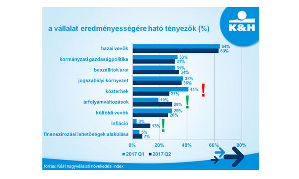 A K&H arra kereste a választ, hogy a hazai, 2 milliárd forint éves árbevételt meghaladó, nem-állami nagyvállalatok működését, eredményességét mi befolyásolja leginkább. „Habár a belföldi kereslet mindig is kiemelt fontossággal bírt a hazai vállalatok számára, az elmúlt másfél évben jelentősen felértékelődött a fontossága. Jelenleg a vállalati döntéshozók közel kétharmada (63%) véli úgy, hogy a hazai vevők a legfontosabbak a cég jövedelmezősége szempontjából. Mivel a kiskereskedelmi forgalomban több éve növekvő trend figyelhető meg, nem meglepő, hogy a belföldi keresletre támaszkodnak leginkább a cégek” – részletezte az eredményeket Patrick Van Overloop, a K&H Üzleti ügyfelek divízió vezetője.