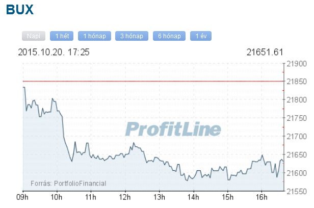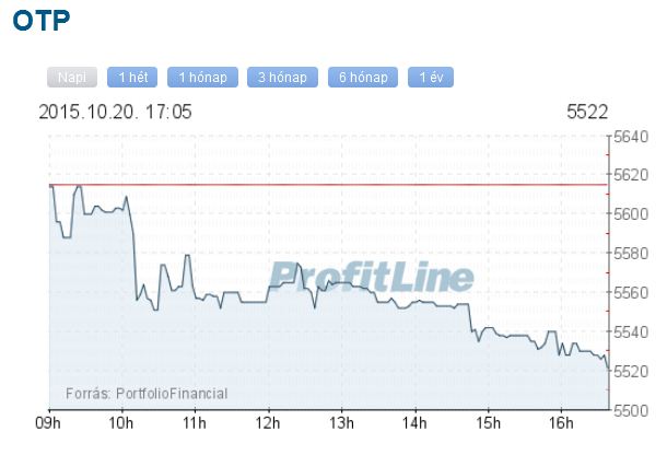 A Mol 20 forinttal, 0,15 százalékkal, 13 230 forintra csökkent, 967,5 millió forintos forgalomban. Az OTP részvények ára 93 forinttal, 1,66 százalékkal, 5522 forintra esett, forgalmuk 3,7 milliárd forintot tett ki. A Magyar Telekom árfolyama 4 forinttal, 1,04 százalékkal, 382 forintra gyengült, forgalma 1,0 milliárd forint volt. A Richter árfolyama 35 forinttal, 0,75 százalékkal, 4635 forintra csökkent, forgalma 2,4 milliárd forintot ért el.