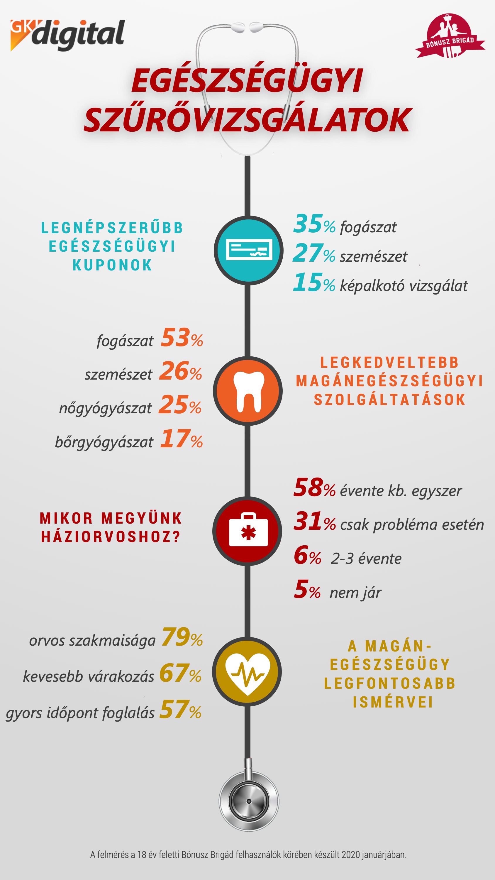 A kutatásban részt vevők 30%-a évente, 28%-a félévente keresi fel saját háziorvosát – 31 százalékuk pedig csak baj esetén fordul orvoshoz, 5% magánintézményben végezteti el az általános szűrővizsgálatot – ez derült ki a Bónusz Brigád és a GKI Digital 2020 januárjában végzett felméréséből.