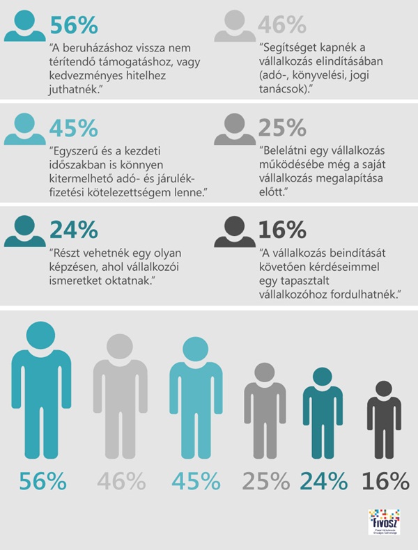 A fiataloknak leginkább pénzügyi segítségre van szüksége a vállalkozásalapításhoz: 56 százalékuk venne igénybe vissza nem térítendő állami támogatást vagy kedvezményes hitelt – derül ki a Fiatal Vállalkozók Országos Szövetségének (FIVOSZ) 3500 18 és 40 év közötti fiatal megkérdezésével készített országos reprezentatív kutatásából. Valamivel kevesebb mint felük, 46 százalékuk adó-, könyvelési és jogi tanácsokat szeretne kapni, és majdnem ugyanekkora arányban vannak azok, akik olyan mértékű adó- és járulékfizetési kötelezettségre vágynak, amely már a vállalkozás indulásakor is könnyen kitermelhető. Nagyjából minden ötödik fiatal venne részt olyan képzésen, ahol vállalkozói ismereteket oktatnak.