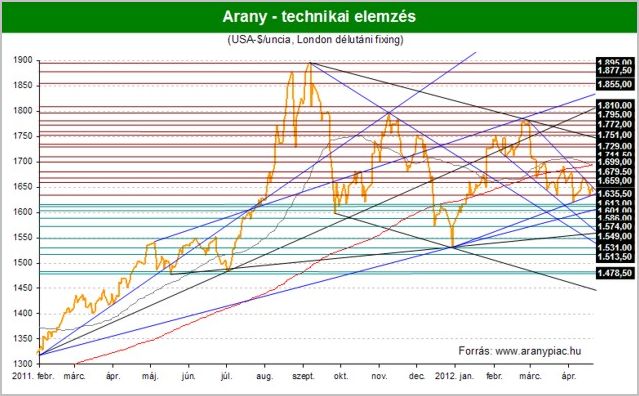 Az arany árfolyama az év eleji gyors emelkedését korrigálja változatlanul. Ennek keretében megközelítette a kurzus korábban már az 1.600 dollárt is, de egyelőre tartja még magát e fontos lélektani szint fölött. Az árfolyam görbéje a korrekciós trend felső határvonala mentén tartózkodik jelenleg. Ahhoz, hogy a korrekció végéről lehessen beszélni, szükségszerűen ki kellene törni ebből a lefelé irányuló rövidtávú trendcsatornából, de igazán meggyőző emelkedésről csak 1.700 dollár felett, az 50- és 200-napos mozgóátlagok átszelését követően, lehetne beszélni.