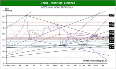 Az ezüst jegyzése állhatatosan követi az immár egy éve tartó csökkenő trend felső határolóját. A stabilizálódás jele, hogy a volatilitás érzékelhetően alábbhagyott az utóbbi két hétben, és fontos támaszszintek sincsenek egyelőre akut veszélyben. Az árfolyam alakulásában megmutatkozik, hogy a piac minden kínálatot képes jelenleg felvenni, ezért nagyobb a valószínűsége annak, hogy a korrekció lassan a végéhez közeleg, mint egy további folytatásnak.