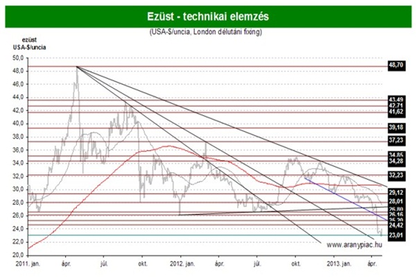 Míg az ezüst a nagy esés előtt jobban tartotta magát az aranynál, most ennek éppen az ellenkezője az igaz. A szürkésfehér nemesfém árfolyamáról ismét elmondható, hogy bár erősen korrelál a nagytestvérrel, mégis sokkal szélsőségesebben mozog. Az ezüst alulteljesítése talán annak tudható be, hogy a befektetők egyelőre kivárják, mi történik az aranynál, és inkább csak ez után vesznek fel pozíciókat. A következő szóba jövő ellenállási szint 24,42 dollárnál található, 23 dollár alatt pedig nehezen feltérképezhető mélységek kezdődnének.