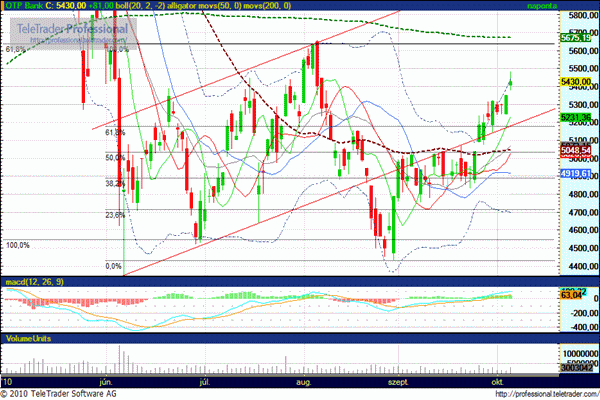 Határozott lendülettel folytatódott az emelkedés, a 5380 forintos ellenállási szinten réssel lépett túl, igaz a a nap végén már mutatkozott némi eladói nyomás.