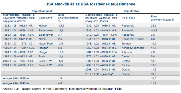 Négy republikánus elnöki időszak végére árfolyamcsökkenés következett be, míg a demokrata elnöki terminusok közül csupán egy zárult negatív árfolyam-emelkedéssel. Míg a demokrata elnökök irányítása alatt álló amerikai kormányok idején a tőzsdei árfolyamok évente átlagosan 10,0 százalékkal emelkedtek, amikor republikánus elnök állt az ország élén, az emelkedés mértéke mindössze 1,8 százalék volt. Ez a trend a második világháború végétől napjainkig tartó időszakban is egyértelműen kirajzolódik. A demokrata elnökök alatt a részvényárfolyamok 11,4 százalékkal, míg a republikánus kurzusok idején csupán 4,8 százalékkal nőttek.