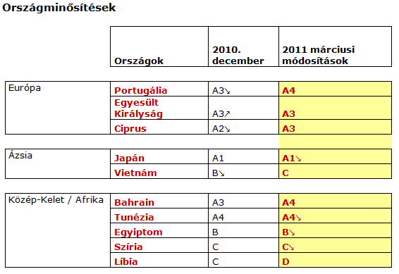 A 2010-es felminősítések után a Coface a napokban tíz országot minősített le. Köztük vannak olyanok, amelyeket már tavaly decemberben is ez a sors ért utol (például Portugália vagy Ciprus), olyanok, amelyeket negyedéve még felminősítettek (Egyesült Királyság), másokat negatív figyelési listára helyeztek (így Japánt vagy Egyiptomot), de a többség besorolását változatlanul hagyta a Coface.