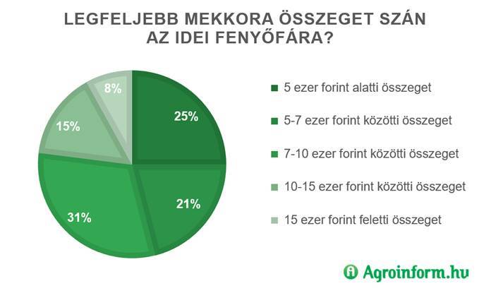 Az idei évben a fenyőt vásárlók 25 százaléka szeretne 5 ezer forinton belül maradni ennél a kiadásnál, 5-10 ezer forint között tervez költeni 52 százalék, míg a maradék 23 százalék 10 ezer forintnál többet is hajlandó kiadni a megfelelő karácsonyfának valóra. A válaszadók 12 százaléka jelezte, hogy fenyő helyett műfenyőt díszít karácsonykor. Ebben a körben legfőbb indokként a válaszadók fele a környezetvédelmet jelölte meg, 39 százalékuk a lehulló tűlevelek hiánya miatti tartósságot és tisztaságot, míg 11 százalékuk a többszöri felhasználhatóság miatti árelőnyt említette.