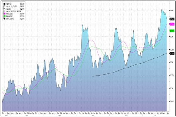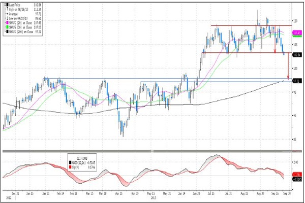 A WTI típusú olaj árfolyama július és augusztus között alapjába véve a 103,2 és 109 dollár közötti tartományban oldalazott, bár néhány alkalommal, főleg a geopolitikai feszüétságel hatására ebből felfelé kiszúrt. A sáv alsó szélének áttörését követően a technikai kép alapjána az árfolyam 97-98 dollár közelébe csökkenhet. Ott azonban több fontos támasz is torlődik, így ezek könnyedén megállíthatják az árfolyam további csökkenését. Az első ilyen fontos támaszszint 98,3-nál a másik 97,3 dollárnál várható. Ráadásul köztük helyezkedik el a 200 napos mozgóátlag is 97,4 dolláros értéknél.