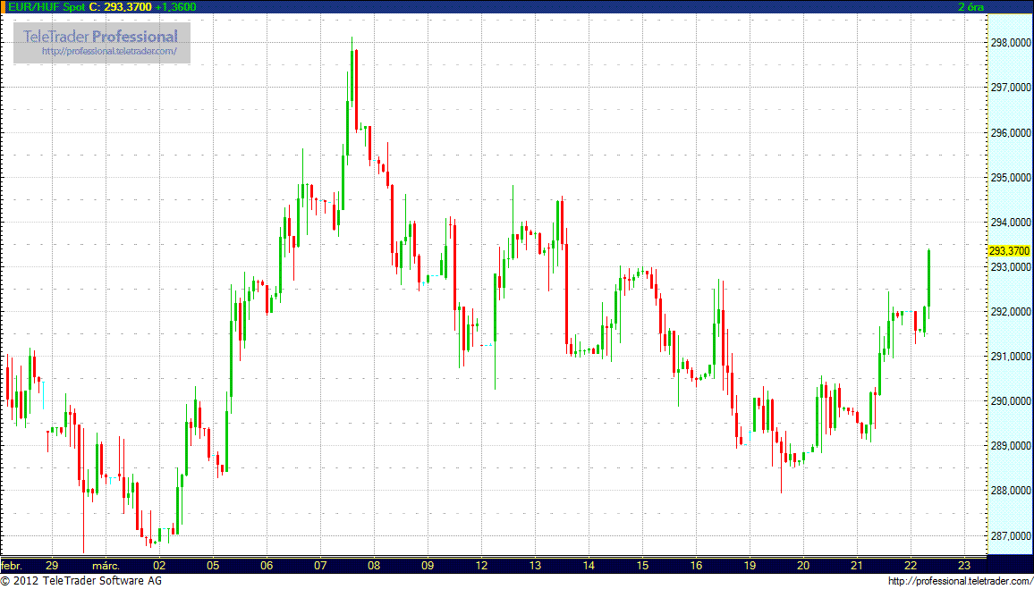 Az eurót csütörtök délelőtt tízkor 293,34 forinton jegyzeték a bankközi deviza kereskedelemben a reggel hét órai 291,90 forint után. A forint szerdán a délelőtti 289,85-ről délutánra 292,25-ös szintig gyengült.