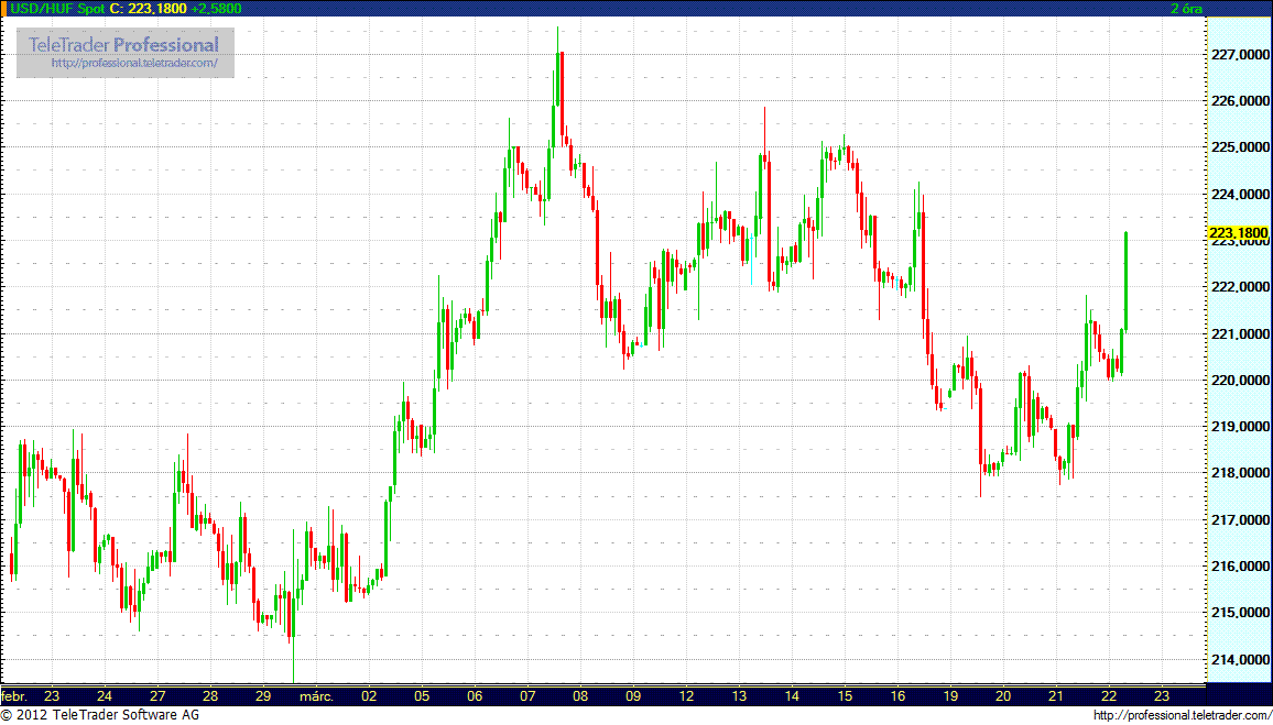 A dollár jegyzése 223,10 forinton áll az előző délutáni 221,42 forinttal szemben, a japán jent pedig 2,6910 forinton jegyzik 2,6387 után.